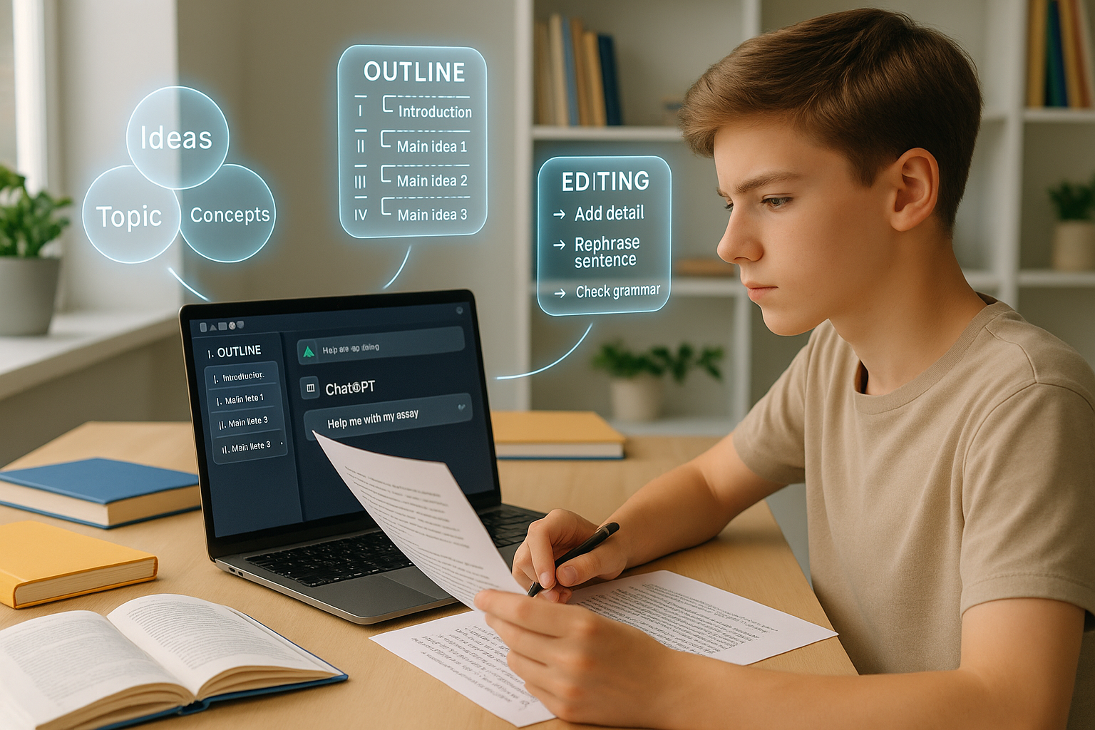 Zobacz, jak AI pomaga w pisaniu wypracowań i esejów: burza mózgów, konspekt, redakcja oraz feedback – etycznie i skutecznie.
